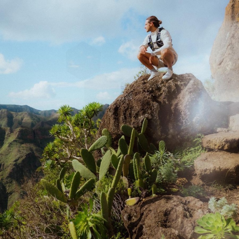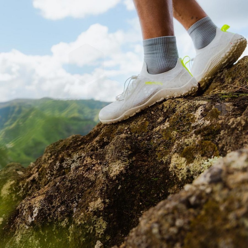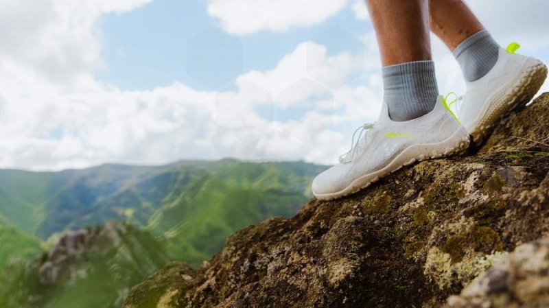 It features a knit upper for enhanced breathability and purer trail mobility, made with recycled materials, and a sock-like construction to keep out trail debris.