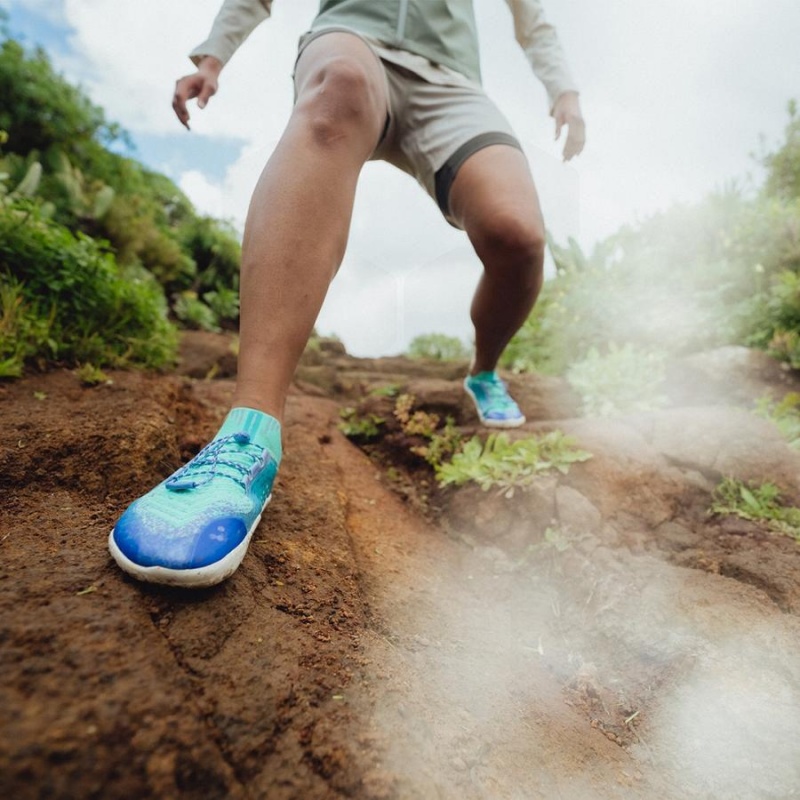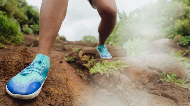 It features a knit upper for enhanced breathability and purer trail mobility, made with recycled materials, and a sock-like construction to keep out trail debris.
